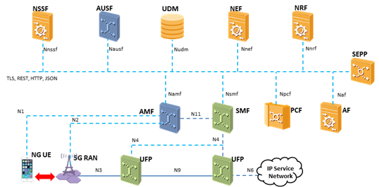 A Service-Based Architecture é um modelo em que os componentes da rede central (NF – Network Function, por exemplo, AMF, SMF, UPF, NRF, etc) são implementados como serviços independentes que se comunicam entre si por meio de interfaces abertas e padronizadas, chamada SBI (Service-Based Interface), geralmente usando APIs RESTful sobre HTTP/2.