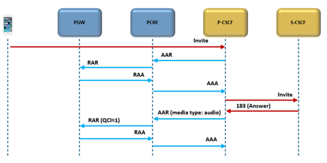 A figura a seguir mostra o trecho de uma troca de mensagens envolvendo PCRF pelas interfaces Gx e Rx durante o estabelecimento de uma chamada.