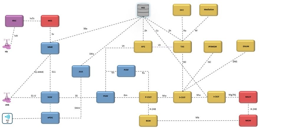 O foco desse documento é a rede IMS, porém é necessário apresentar a integração com os demais elementos de rede, por isso abaixo apresento a topologia básica IMS integrada com os elementos da rede 4G (core PS), da rede 3G (core CS) e da rede de acesso.