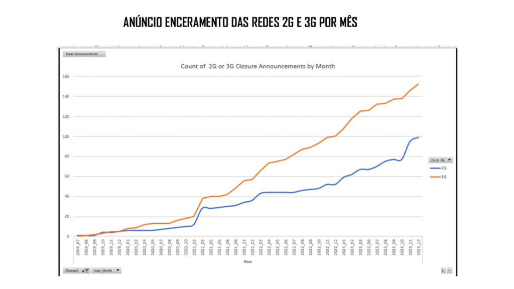 O gráfico abaixo de entre 2019 e 2023 mostra uma corrida por parte das operadoras de diversos países para enceramento das redes 2G e 3G.