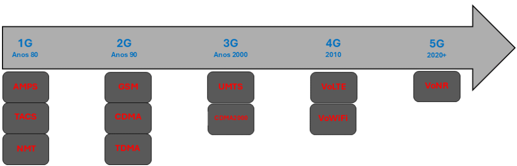 - Primeiras redes móveis (AMPS nos EUA, NMT na Europa)