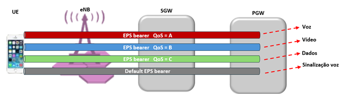 É importante reforçar que não há comutação por circuito na rede 4G/LTE e os serviços de telefonia (voz, vídeo e SMS) são implementados como mais um serviço de pacote. A figura a seguir mostra os EPS bearer que são túneis criados entre o terminal móvel e os PDN Gateway (PGW) para transporte pela rede 4G/LTE de serviços, como voz, vídeo, tráfego de dados, etc.