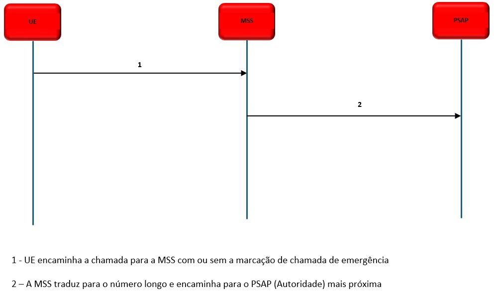 Uma chamada ao chegar na MSS com a marcação de chamada de emergência é imediatamente encaminhada para o PSAP (Número da autoridade) de acordo com a categoria ou número recebido do terminal, podendo ser número de polícia, bombeiro, entre outros.