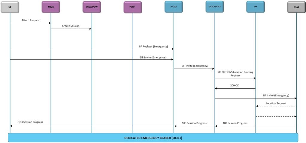 E-CSCF – É responsável pelo controle das chamadas de emergência. Ao receber a chamada de emergência o E-CSCF consulta o LRF para tradução para o número “real” do PSAP